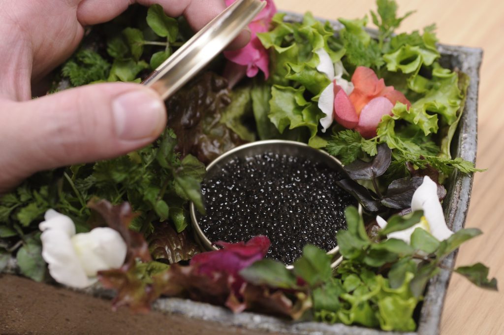 メインの焼肉以外にも、オリジナリティ溢れる料理の数々が。「キャビアユッケ」は瓶詰めにされた状態で提供。シャトーブリアンを塩タンで挟みサンチュで巻いて食べる「シャトーブリアンのタンサンド」など、美味しさだけでなくサプライズ要素が散りばめられたメニューが多数存在。