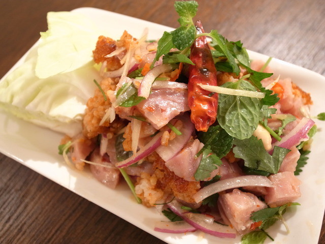 おすすめはネーム・クルック。発酵ソーセージとおこげがサラダになっている。ピリ辛の味付けに玉ねぎやキャベツなどのシャキシャキの食感がアクセントになっている。こういった本格的なタイ料理が安く頂けるというのも大きな魅力だ。