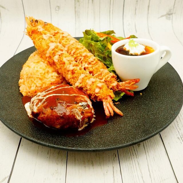 エビフライが2本とハンバーグ、チキンライス、デザートを一度に楽しめる「大人のお子様ランチ」は童心をくすぐる人気の一皿。