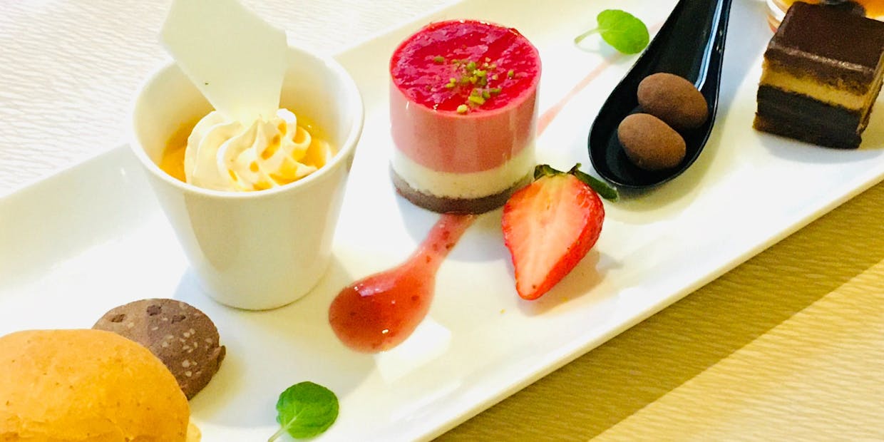 品よく盛られたスイーツは「苺と杏露酒ジュレ バニラパンナコッタ」や「ジャスミンムース」など、アジア料理店ならではの品々。オニオングラタンスープやカツサンドもついた、ボリュームある内容です。熱々ふかふかの台湾カステラが、幸せな余韻を残します。