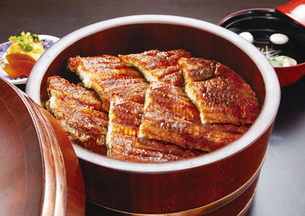名店が誇る「うなぎ櫃まぶし」は、鰻もお米もタレに使うたまり醤油もすべて愛知産。香り高い醤油が、鰻の味をさらに引き立ててくれる。毎朝職人がひとつひとつ手開きし炭火焼きする鰻のこんがりした焼き目に、食欲も刺激されるだろう。