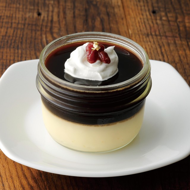 この店ではおしゃれなカップに入ったスイーツが人気。プリン、あんこ、コーヒーゼリーが美しい層をな「あん珈琲プリン」はトップに金箔のトッピングも。ほろ苦さを感じる大人のスイーツである。