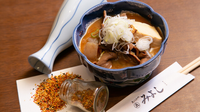 こちらのお店に訪れたら絶対に頼んでおきたいメニューが、名物の「もつ煮込み」だ。新鮮な豚もつを長時間煮込んだこだわりの逸品で、卓上にある堺市『やまつ辻田』の特製七味をかけることでより風味が引き立つ。