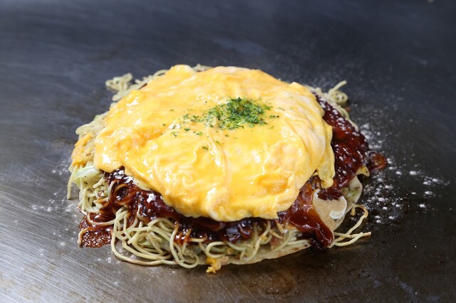 人気のそば肉たまご入りは、お好みソース、ガーリックパウダー、青のりがたっぷり。お好み焼きの味もしっかりしており、柔らかく仕上がった卵もマッチした極上の一品だ。2階には座敷席もあるので、ファミリーで楽しむのもオススメ。