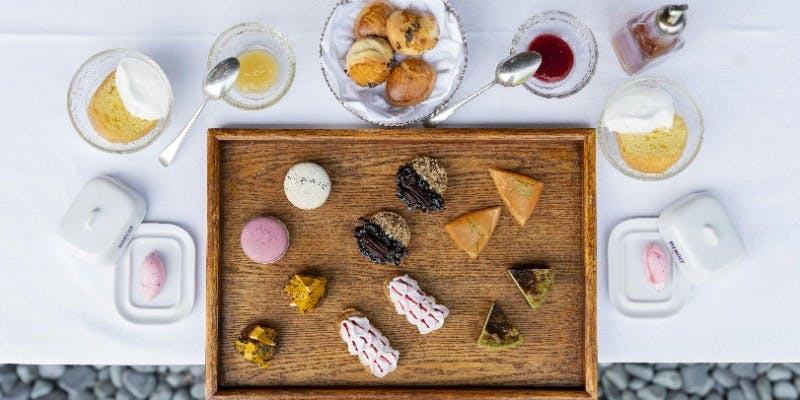 上質な木製プレートに品よく並ぶのは「ほうじ茶のチーズケーキ」や「いちごとバジルのタルト」などひとひねりくわえたスイーツたち。フォアグラやリコッタチーズを使用したセイボリーにも注目です。前日17時までの予約制なので、忘れずに予約しましょう。