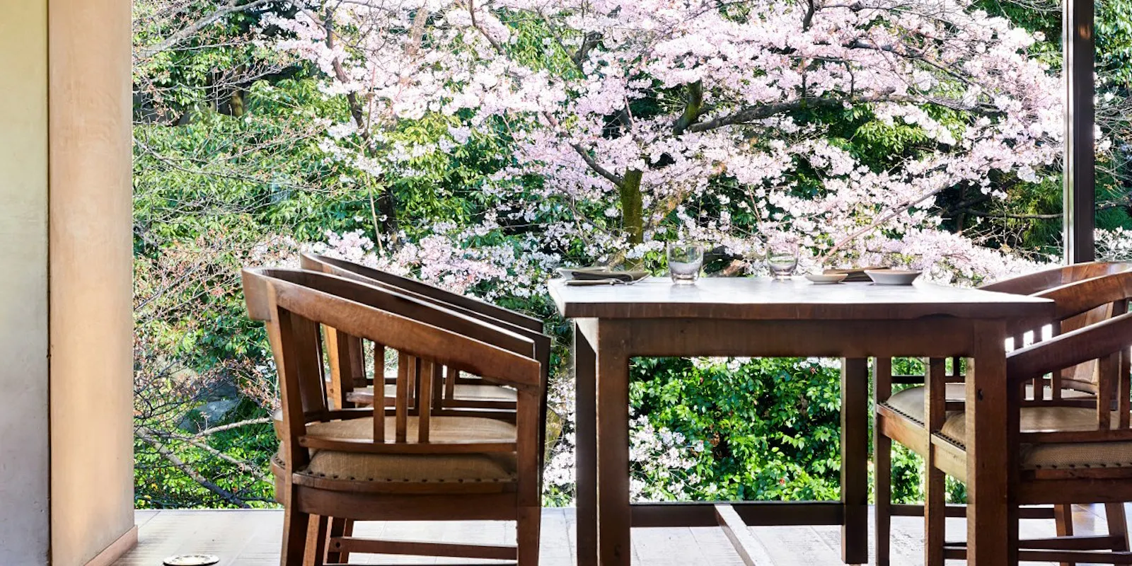 店内からは美しい日本庭園を望むことができ、春には嵐山に咲く桜がまわりを華やかに彩ります。桜色に染まる嵐山を眺めながら、ゆったりと食事を楽しんでください。