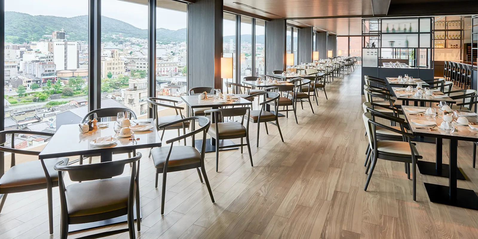 京都の隠れた桜名所として知られる、高瀬川沿いに建つ「THE GATE HOTEL 京都高瀬川 by HULIC」。最上階にある「Anchor Kyoto」は、京都の大パノラマを独り占めできるオールデイダイニングです。