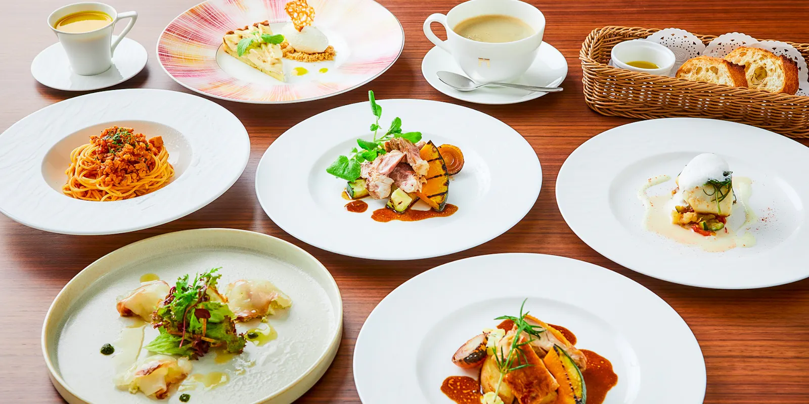 夜には前菜盛り合わせに飲み放題が付いた特別プランも用意(一休限定)。ビールやワインのほか、ゲートホテルオリジナルスパークリングも楽しめます。また、女性グループ限定で、3時間フリーフロー付き個室確約ディナーも用意されています(4名以上)。