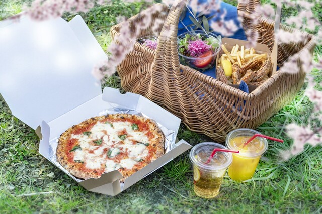 テイクアウトのピクニックボックスも、ピザやポテトと内容盛りだくさん。レジャーシートも付いているので、気軽にお花見ピクニックが楽しめます。そのほか、手ぶらBBQプランやディナーコースも用意。桜の時期は混み合うので、早めに予約しましょう。