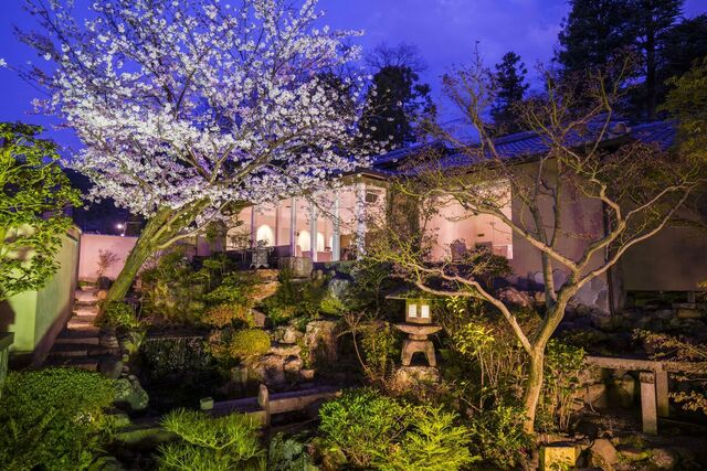 夜にはライトアップされた桜も楽しめる同店。ピンク色に染まる庭園が、非日常のひとときを味わわせてくれます。