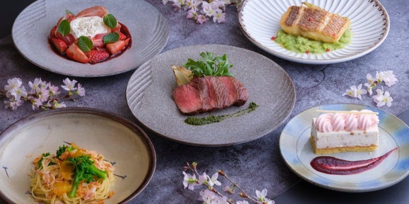 現在はディナー限定で「桜コース」を展開。前菜、手打ちパスタ、メイン2種、デザートの5品が味わえます。旬の食材を使用した料理は、一皿一皿が春を感じるもの。キッズメニューもあるので、家族のお花見ディナーも最適でしょう。