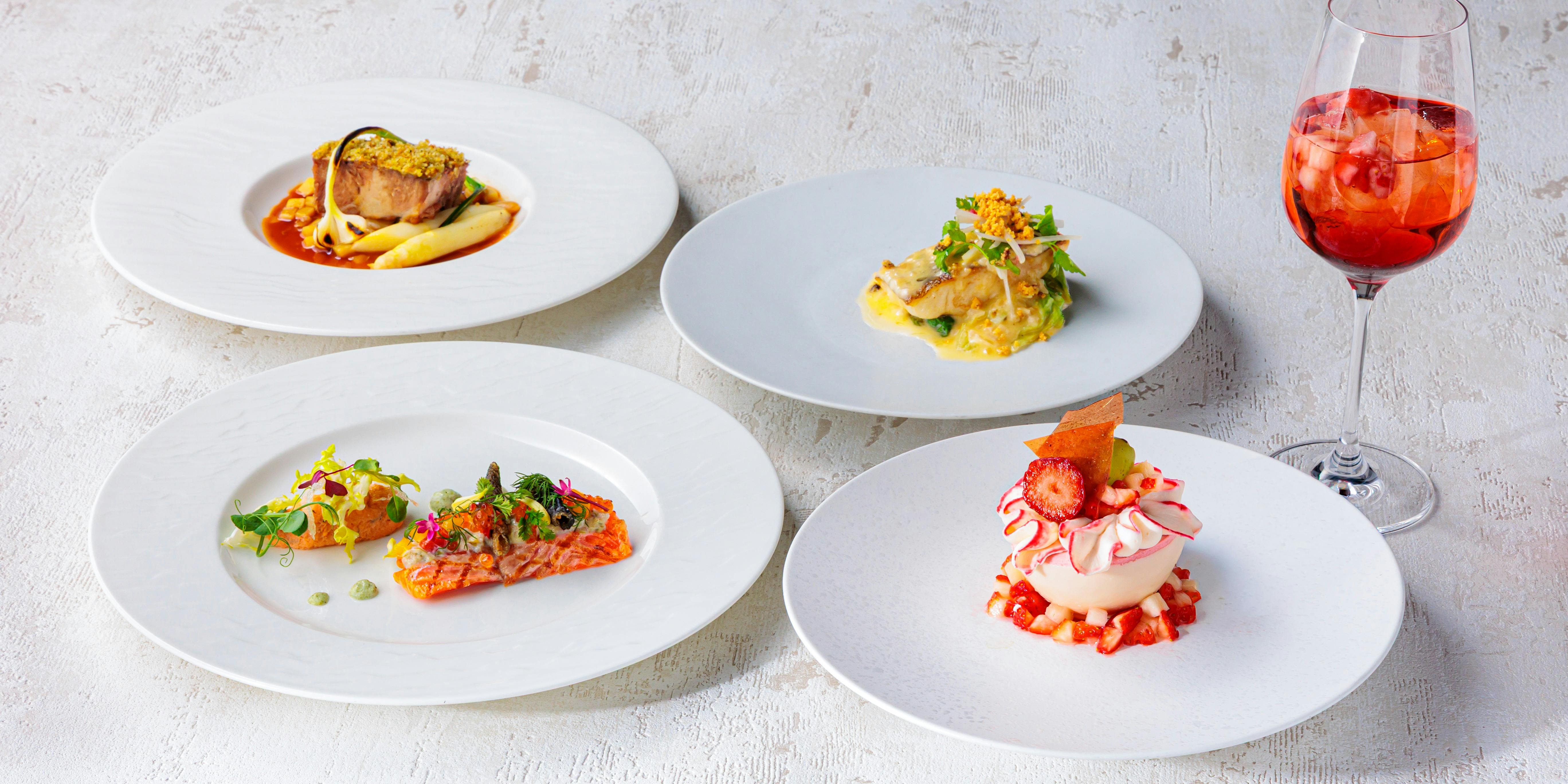 優美な桜と味わえるのは、前菜、メイン、デザートすべてが選べるプリフィックスランチ。それぞれ4種類ほどのメニューから選択でき、デザートには「桜風味のジェラート」や「苺のフレジエ」など、春らしいスイーツがそろいます。
