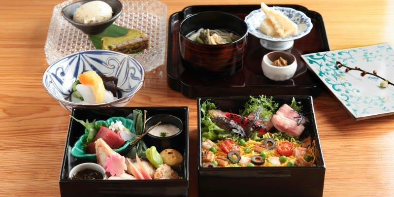 3月23日~4月9日は、期間限定で湯豆腐&桜カクテル付きの「お花見お茶席弁当」を提供。木枠の器に八寸や焼物、お造りなど色鮮やかなメニューが並び、目でも舌でも楽しませてくれます。口の中でふわりとほどける湯豆腐は、ほかでは味わえない上品な口当たりです。