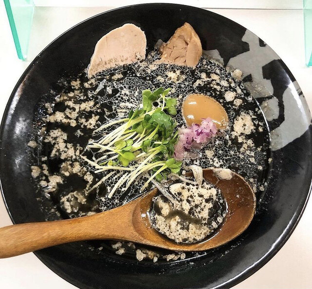 真っ黒いスープはインパクト大!炭焼き風味はクセになる味