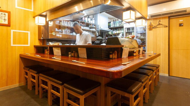 日本各地の蔵元に直接出向き仕入れられた地酒が料理の旨さを引き立てる。難波千日前店は1階カウンター13席、2階に45席のテーブル席がある大きな店だが、平日でもすぐに満席になる人気店。来店の前には予約を入れておくと安心だ。