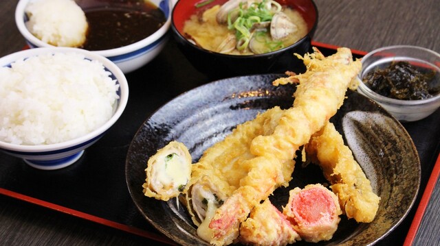 平日はお得なランチセットも用意されている。例えば「名物!大吉セット」は、大エビ、キス、ちくわと本日のおすすめ2品というラインナップ。それに、ご飯と名物のあさりの味噌汁が付いてくる。サックリと揚げられた立派な有頭エビの天ぷらに、アサリの旨みたっぷりの味噌汁がベストマッチだ。