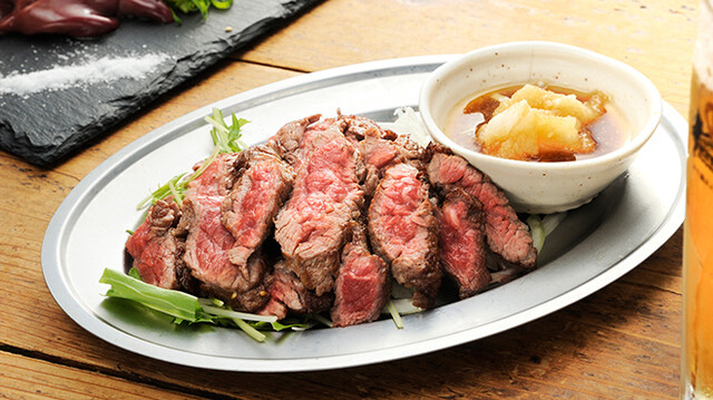 またお酒に合う料理は約50種類以上で、ほとんどが500円までという驚きの価格設定で、なかには5円のメニューも。一押しは「大満足のビフテキ」。赤身を残したボリュームたっぷりのビフテキは、噛めば噛むほどに旨みを感じると評判の一番人気を誇るメニュー。