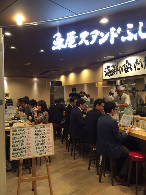 昼から飲めると評判の海鮮居酒屋、魚屋スタンドふじ。店名のスタンドは、新鮮な魚介料理を立ち飲み式居酒屋価格で提供するという意味で、店内にはカウンター席はじめテーブル席も椅子を完備しているので安心。