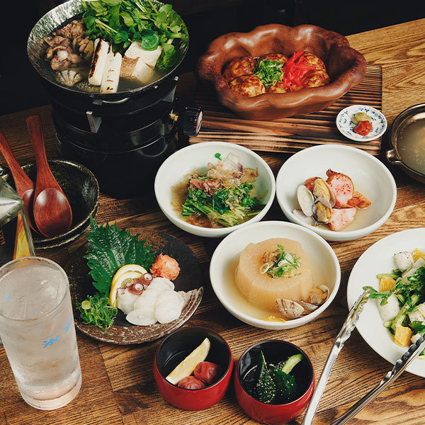 食材の産地直送とリーズナブルな価格にこだわった人気の居酒屋、地酒蔵大阪。誰もが気軽に立ち寄ることができるアットホームで居心地の良い店内には、一人でも楽しめるカウンター席、宴会やパーティーも可能な広々とした座敷のほか、雰囲気の異なるテーブル席が用意されており、ゆっくりと過ごすことができる。