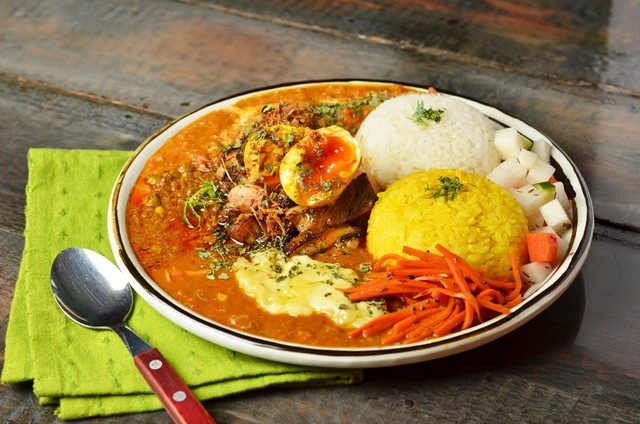 こちらのカレーをおいしく食べるコツは、プレート上のカレーやおかずを、好きなバランスで混ぜるという方法。混ぜる分量しだいで味が変わるのが、こちらのカレーの醍醐味だ。