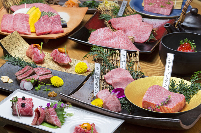 「厚切り極上タン塩」や「極上ハラミ」のほか、ステーキとして「シャトーブリアン」や「サーロイン」などの極上部位を提供。器にもこだわっているので、見た目も楽しみながら特選肉を味わうことができる。