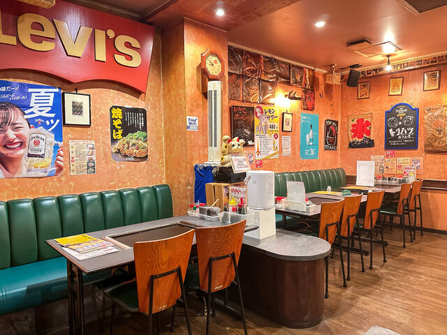 一見お好み焼きやもんじゃ焼きのお店とは思えないような、アメリカンレトロなインテリアが楽しい店。お好み焼きももんじゃ焼きもバリエーションが豊富で食べ飽きない。