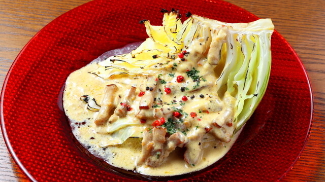 なかでも人気No.1を誇るメニューが、「朝採れキャベツのロースト」だ。キャベツの葉1枚1枚にチーズを挟み込み、自家製ベーコンと贅沢な生クリームソースで煮詰めた逸品。