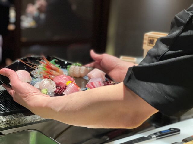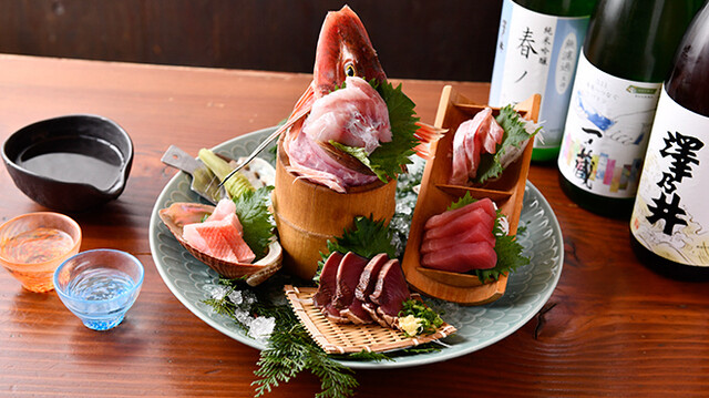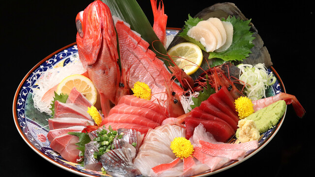 看板メニューであるお刺身の盛り合わせは、プリプリと弾力性があり、新鮮さが感じられる。また1つ1つのお刺身ごとに漬けや昆布締め、炙りなど職人の一工夫が加えられている。1つの料理で魚の旨みを、贅沢に引き出した味わいを堪能することができる。