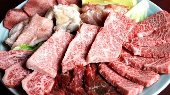 特選和牛三種盛皿は希少なザブトン、いちぼ、トモサンを一度に味わえる。それぞれ牛1頭から取れる部分が少ないので目にすることも稀だ。200gの盛り合わせで、2-3人で食べるのがちょうどいい。ほかにもホルモンや鶏、豚肉、海鮮焼き、野菜焼きなどメニューが幅広い。コースは3500円から6500円の3種類が選べる。落ち着いた雰囲気の店内。個室もあるので子供連れの方も安心だ。