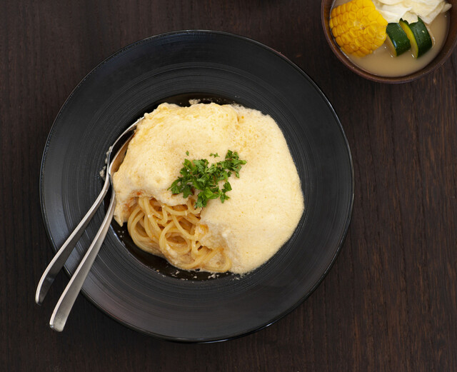 「ゆず明太子の豆乳クリームパスタ」。冷たい豆乳スープに漬かったパスタと、明太子と小葱と胡椒だけのシンプルな逸品だ。平打ちでもちっとした食感。冷製ならではのコシもある。豆乳クリームのコクに、明太子と胡椒の辛みがアクセント。