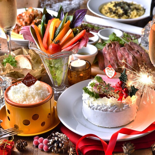 2時間飲み放題付きの「パーティーコース」は4600円。メニューの例は鮮魚のカルパッチョ3種盛り、いろいろ野菜のバーニャカウダ、ガーリックトースト、本日の前菜、アクアパッツァ、肉の盛り合わせ、本日のパスタなど。