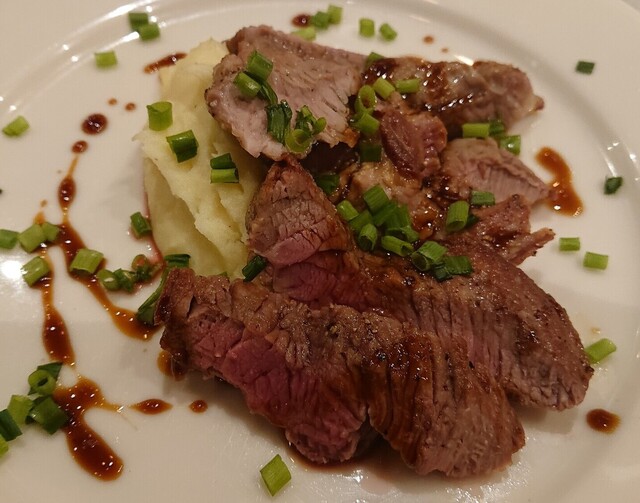 葡萄牛のランプ。赤みがきれいに残った絶妙な焼き加減。やわらかく心地よいかみごたえ。ランプはしつこくなく、肉の旨みを噛むほど味わえる。ソースも美味。