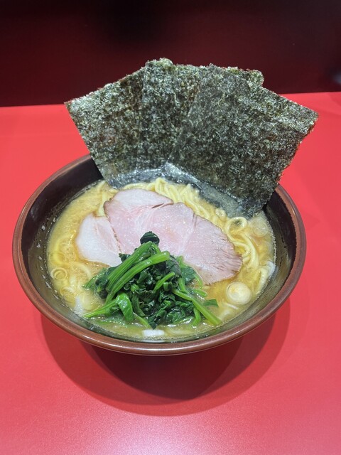 歯ごたえがありつるりとした食感の麺は三河屋製麺の中太麺を使用。ミルキーな豚骨ベースのスープに、ホウレンソウ、焼きのり、チャーシューが載った王道家系のトッピング。追加できるトッピングに鶏チャーシュー、スモークモモチャーシュー、厚切りバラチャーシュー、トントロなど肉系が充実しているのが特徴。