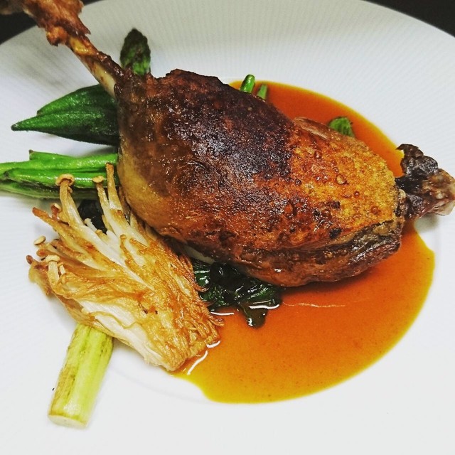 選べる料理は日替わりだが、おすすめは鶏もも肉のコンフィ。もしもメニューにあればぜひこちらを。パリッとした皮がジューシーな肉汁を閉じ込めた、こちらの看板料理である。
