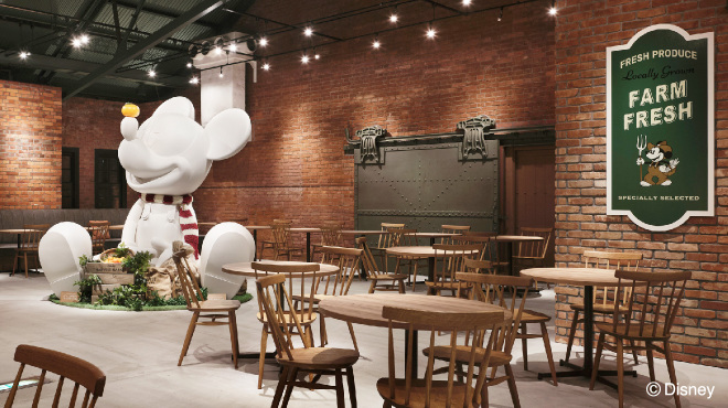 ディズニーの世界観を再現した店内には、いたるところにミッキー&フレンズが。「Disney HARVEST MARKET By CAFE COMPANY 」はディズニー気分に浸りながら食事ができるカフェ&ギフトショップです。