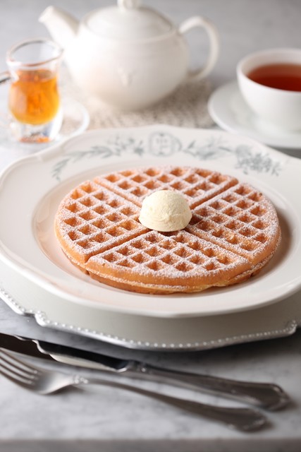 低温殺菌牛乳を使用したこだわりの「イングリッシュミルクティー」はポットにたっぷりと入って提供され、香り高くすっきりとした味わい。英国式ティータイムが好きな人にはたまらない、クロテッドクリームをつけて食すティーワッフルも是非味わってほしい。可愛らしい空間で紅茶とワッフルを堪能して。