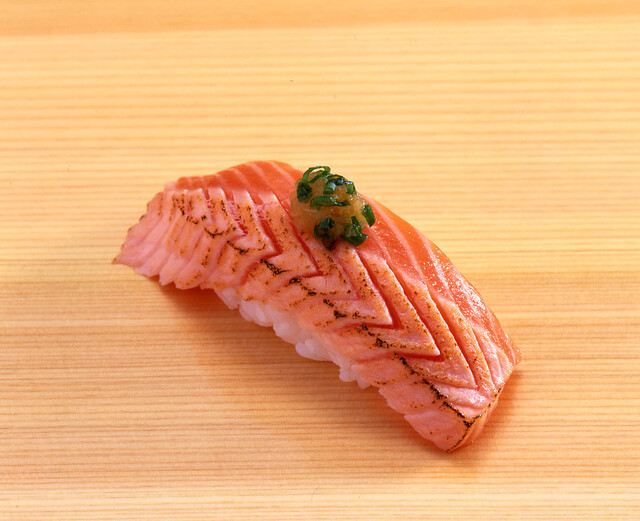 回転寿司といえば、変わりダネが楽しい。香ばしい香りと、ジューシーな味わいが特徴の人気の炙り。にぎりの一押しは、「あぶり三貫塩」トロ・えんがわ・サーモンの3貫盛り。香ばしく炙ったネタ3つと能登の竹炭塩が口の中で溶けあい、思わず笑みがこぼれる。