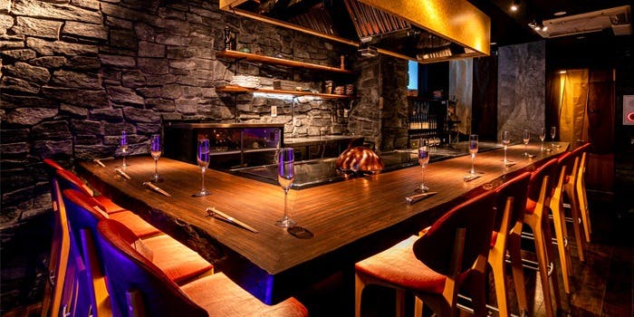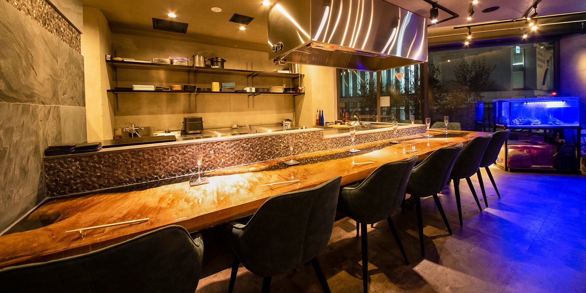 店内に点在する重厚感のあるカウンターはすべてに鉄板があり、贅沢にも全席目の前での調理を堪能できる。