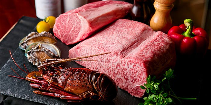 お肉の産地にはあえてこだわらず、プロの目利きで厳選したA5ランクの牛肉を。魚介類はシェフ自ら市場から鮑・伊勢海老・ホタテなど新鮮な素材を仕入れている。