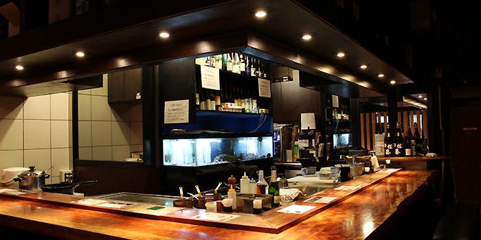 入口に見える活き鮑の水槽や小さな内庭などワクワクを演出する内装が多く、カウンター席では鉄板焼きのお店としては珍しい、楽しげな雰囲気が感じられる。