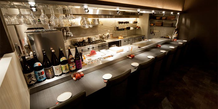 壁やカウンターなど黒を基調に揃えられ、間接照明に照らされた店内はおしゃれで大人な雰囲気。その中で唯一直接ライティングされる、卓上の料理が主役の内装だ。