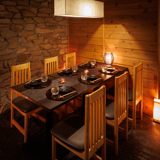 総席数100席を誇る広々とした店内は、和の趣溢れる完全個室も完備。間接照明が灯り、ゆったりとした大人な時間を過ごすことができる。団体用に個室を貸切ることもできるので、歓送迎会などの大型宴会にもぴったりだ。