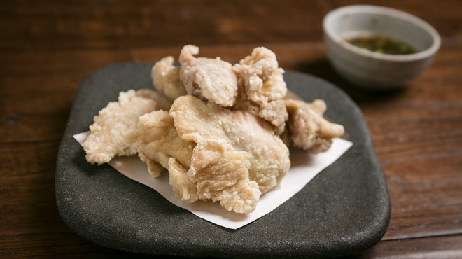 やきとり宮川 赤坂の白い唐揚(880円)は、人気メニューの1つだ。鶏だけでなく調味料にもこだわっており、宮古島の「雪塩」でシンプルな味付けにしている。そのまま食べても美味しいが、自家製のポン酢につけて食べると、さっぱりと酸味が加わり味に深みがでる。ランチでも食べることができ、白い唐揚の他に、ごはん、味噌汁、とろろ、温玉、漬物がついて1200円とお手頃価格である。