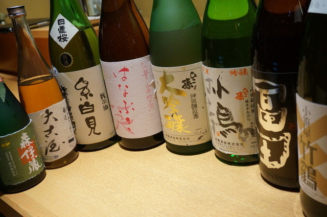 全国から厳選したこだわりの純米酒は「神亀酒造」を始め100種類以上、「森伊蔵」、「村尾」、「魔王」などのプレミア焼酎も約30種類が揃う。お燗番が丁寧に燗を付けてくれるのもまたうれしく、心地よく酔いしれることができる。
