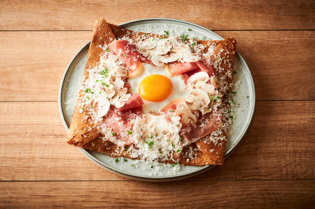 北海道産北早生種のそばの実を石臼で挽いて使っているため、独特な風味と香ばしさのあるガレットが味わえる。