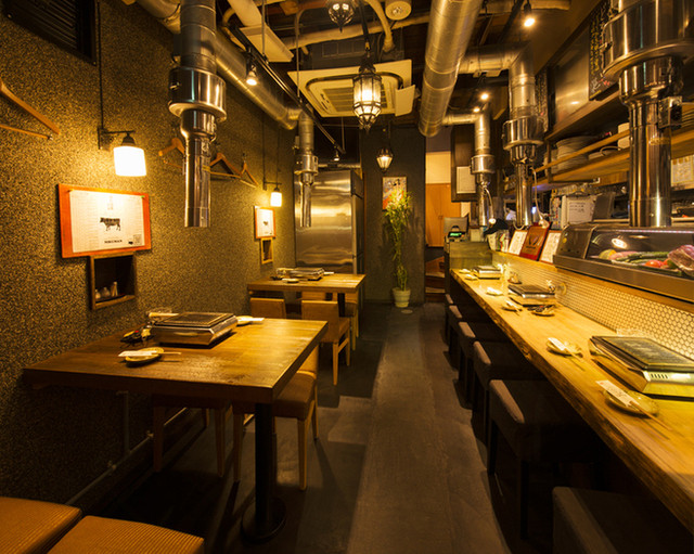 昼と夜とでは店の外観から受ける印象が異なるため、昼間しか知らないという人は夜の店の様子に驚くかもしれない。夜は年季の入った赤い大きなホルモン焼きの提灯がよく目立つ。木のテーブルの上には無造作に置かれた七輪があり、内装も男性的でTHEがつきそうなホルモン焼き店だ。