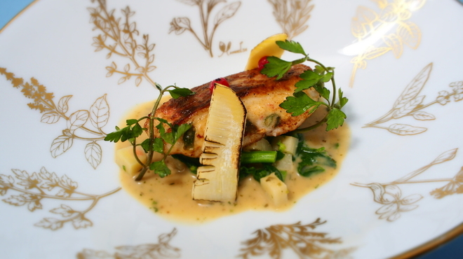 ランチコースは7品4,800円から、ディナーでは「シェフ特選ディナーコース」(13,000円)が用意されている。食材仕入れのこだわりは目を見張るものがある。ライ麦ひとつの仕入れでも農場を指定、鮮魚は漁師を指定するだけではなく魚の締め方にまでこだわっている。デザートの桃も農園が指定されている。全ての仕入れに少しの妥協もない。だからこそ、芸術ともいえるべき一皿が完成するのだろう。