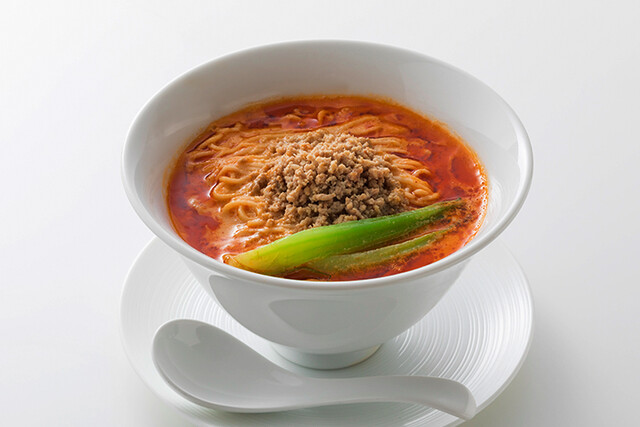 人気の「冷やし担々麺」はクリーミーなベージュ色のスープにラー油の赤が散りばめられて見栄えも美しく、じわじわと心地よい辛さが後から広がる。
