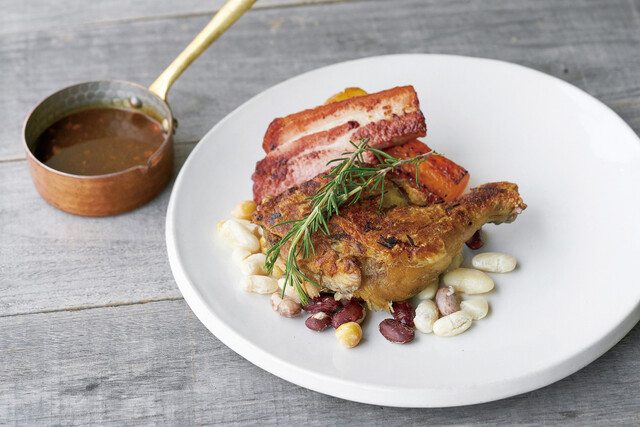 ボリューム文句なしの「鶏もも肉のコンフィと燻製ベーコン グレイビーソース」。ローズマリーでマリネした低温調理の鶏もも肉はホロホロと柔らかい。タンパク質中心で筋トレ中の人にもおすすめ。