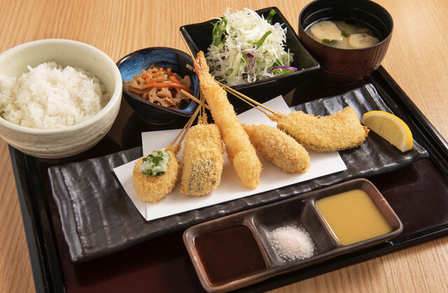 「串揚げ御膳」(1200円)は海老・サバ・豚ヒレなどおすすめ5品の串揚げがセットに。味にしても食感にしても、どれも衣の中でネタがいきいきとした印象で素直においしい。
